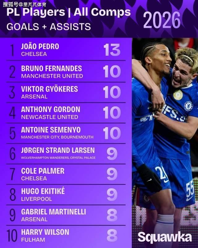 数据机构Squawka统计了2026年以来英超球员在各赛事的参与进球(进球+助攻)数量,并列出榜单。切尔西前锋若昂·佩德罗以参与13球高居榜首。曼联主力B费与阿森纳前锋约克雷斯、纽卡斯尔联边锋戈登、曼城边锋塞梅尼奥同以参与10球第二的。